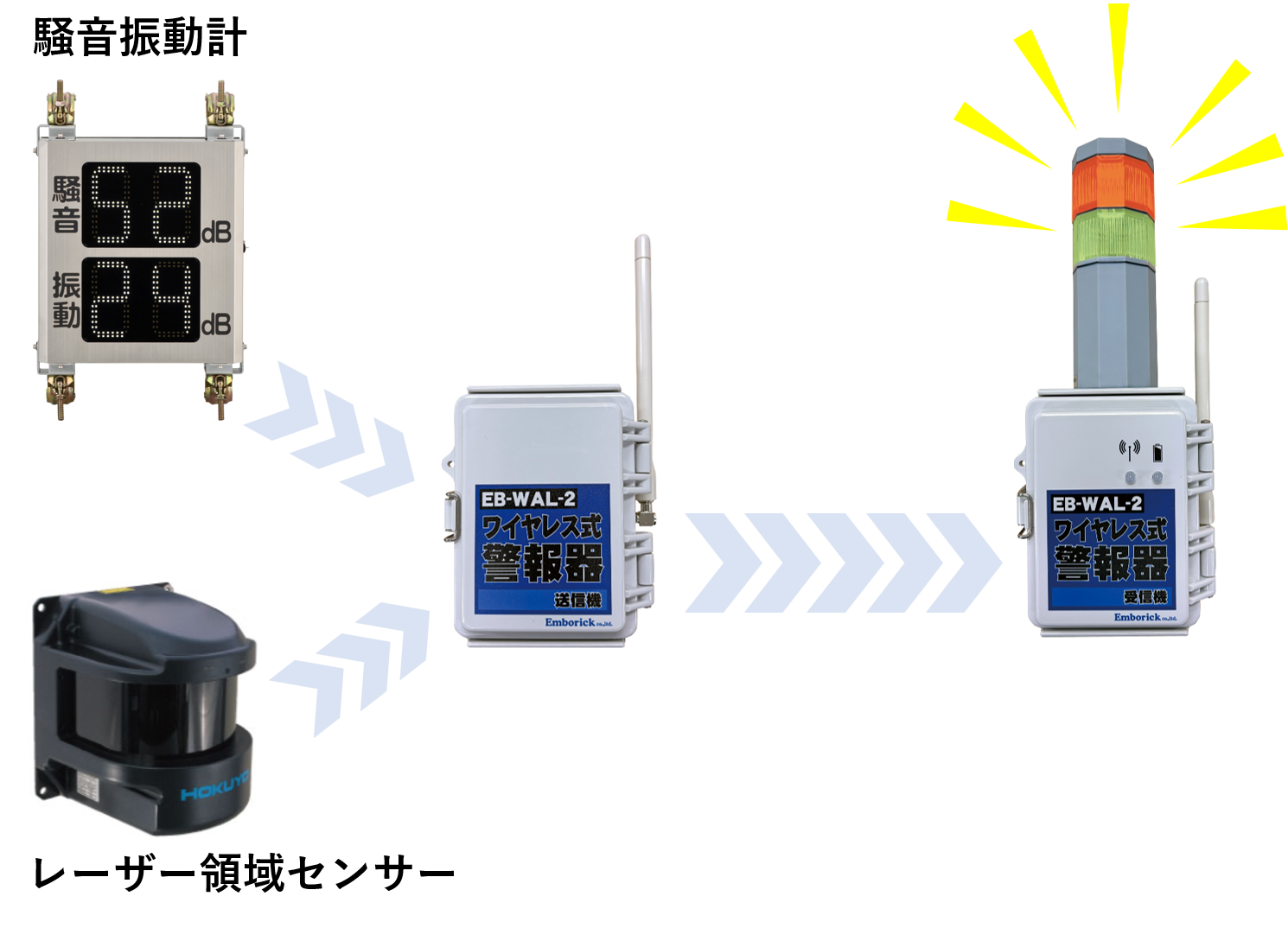 計測センサーと接続して、2色警報灯でお知らせ。危険を素早く知らせる。